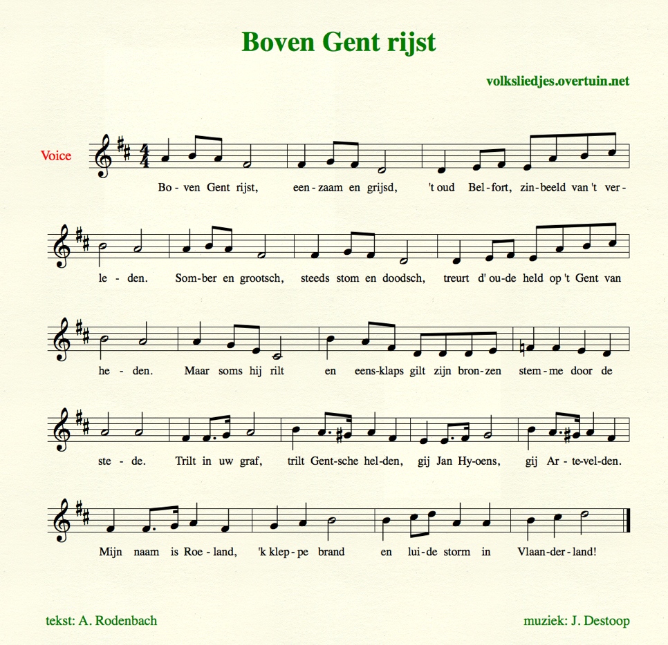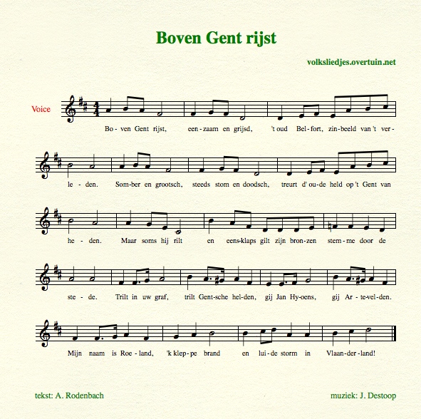 Refrein: op de klok van het Belfort stond: Mijn naam is Roeland, als ik kleppe is er brand, als ik luide storm in Vlaanderland. Bij 'kleppen' wordt er tegen de stilstaande klok geslagen, bij 'luiden' wordt de klok heen en weer gezwaaid.